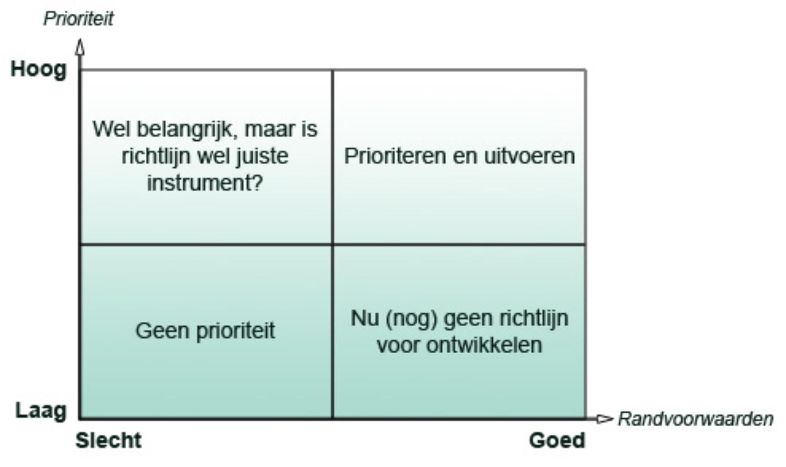 Leent het gekozen onderwerp zich voor een richtlijnontwikkeling of beter voor een andere (kwaliteits)aanpak? Hiervoor kunnen verschillende criteria worden gebruikt, zoals bijv. in onderstaande matrix is uitgewerkt.